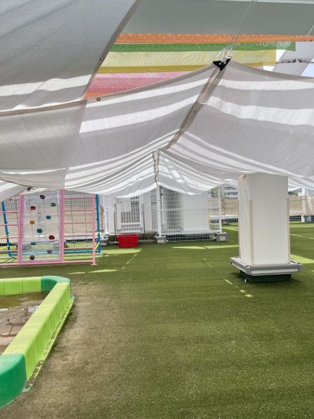 遊具を外して今はプールの準備に取り掛かっている最中で広く、上にはシートが一面に敷いてあって直射日光を受けない工夫がされていました。