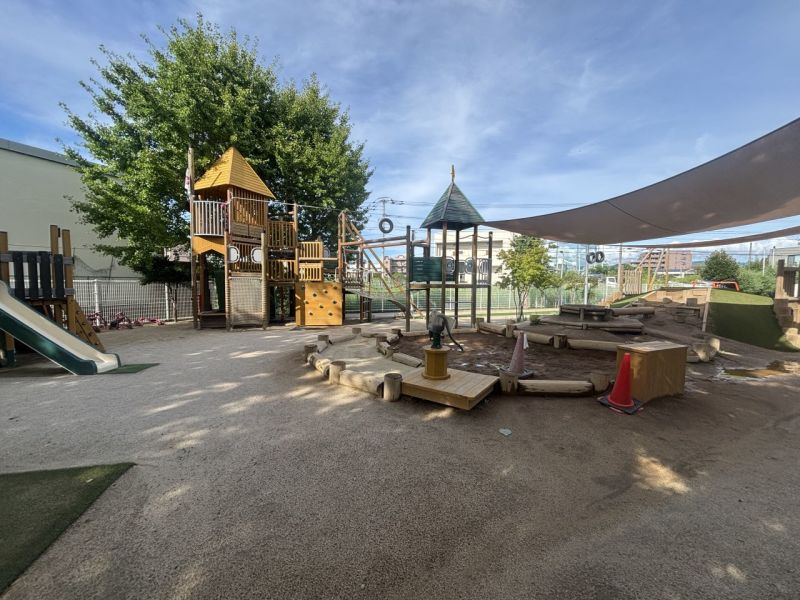 園舎には様々な遊びができる大型遊具がありました。また園舎も外国のような可愛らしい建物で子どもたちが行きたくなる外観でした。保育室もコーナーの場所と歩いたり体操をしたりできる場所と机上遊びができる場所と分けられており、子どもたちも自由に行き来しながら遊ぶことができる環境作りができていました。