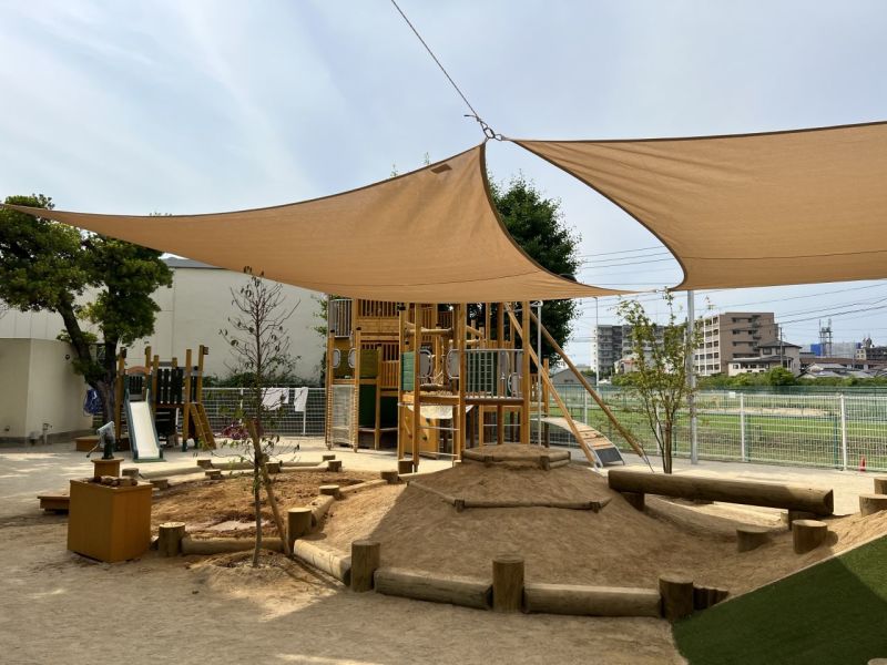 二階建ての保育園で、年中年長さんは2階の保育室でした。園庭にある遊具は5月上旬に建てられ、遊具の工夫で、高く作られているのは子どもが、〜したら危ないなど自分たちで理解、経験できるようになるための環境構成だとおっしゃられていました。失敗してみて学べることが沢山あるので高い遊具で怖い恐怖感を感じる子もやってみると楽しい!と思える子が多いようです。
