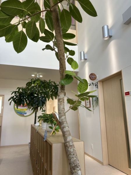白、茶を基調とし、植物の緑も加え暖かな雰囲気の園舎でした。子供を取り巻く環境として園舎までこだわりをもっているところがとても素敵だと感じました。
