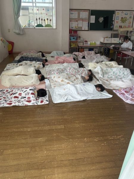 今回はお別れ遠足で近くの公園まで歩いていき、シャボン玉や追いかけっこをして遊びました。帰ってからは保護者が作ったお弁当を食べて、お昼寝をしていました。