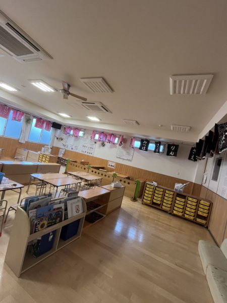 教室の中は広々としていて遊びやすく、跳び箱や鉄棒などがある運動スペースもありました。雨の日でも体を動かすことができて子供たちも楽しそうでした。