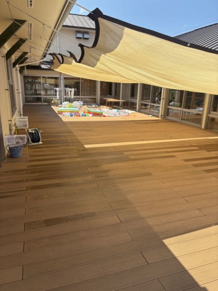 8年しか経っていないのもあり、とても綺麗で、全体的に木造になっており温かみを感じる園舎でした。園庭もとても広く、遊具も沢山あり、どの年齢の子どもでも伸び伸びと遊ぶことができるようになっていました。またテラスもあり、年齢に応じて遊ぶことができるように環境が整えられていました。保育室は廊下の方がガラス張りになっており、外の様子や中の様子がよく見えるようになっていました。